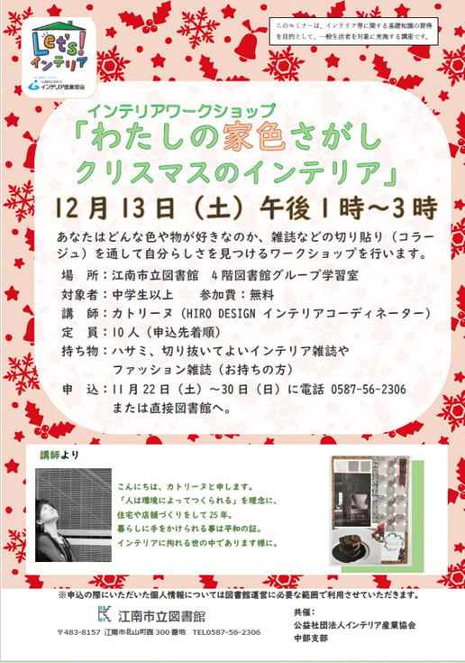 【愛知県開催】(公社)インテリア産業協会中部支部・江南市立図書館 共催 Let’sインテリアワークショップ「私の家色さがし クリスマスのインテリア」 (2025年12月13日 江南市立図書館にて)