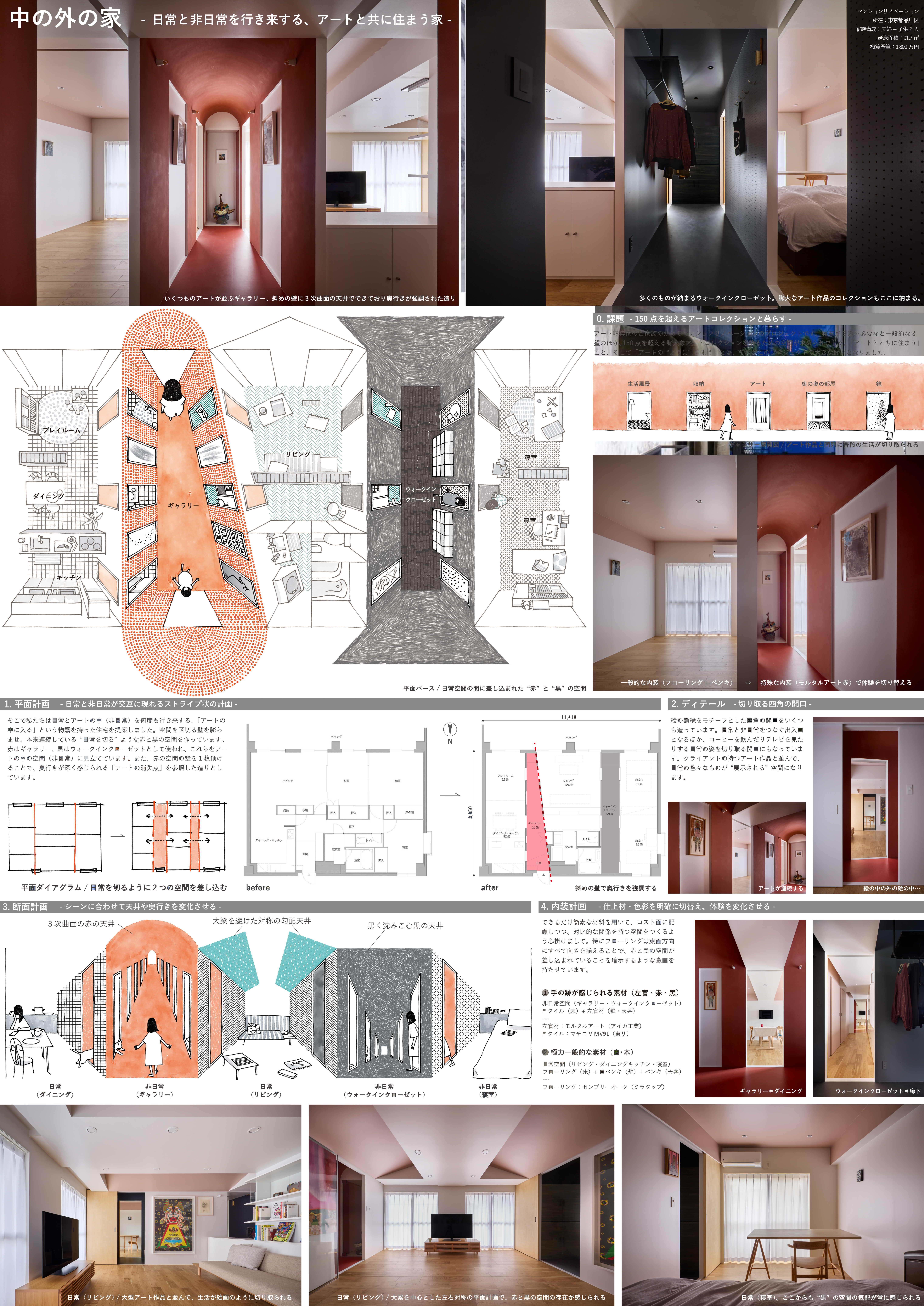 「中の外の家」という「謎々」のような魅力的なタイトルがまず目を引く。そのタイトル通り、日常空間(内)に非日常空間(外)が交互に現れるようにストライプ状に配置された壁が新鮮だ。生活空間を仕切る壁を「アートの中に入る」というコンセプトで配したアイデアは、同時にウォークインクローゼットに生活用品を収める見せる収納によって、日常品をアート同様に大切にする感覚でしゃれている。それぞれの空間は赤色と黒色で彩られ色彩の力と壁材の豊かな手触りによって特別感が演出されている。その空間づくり全てが住まう人に「エネルギー」と共に「安らぎ」を与えてくれるように思う。また四角い開口をいくつも持つことで生活空間とギャラリー空間が視覚的に混ざり合い、住まう人の個性と趣味が際立つ効果がさらに日常的に五感を刺激し育むだろう。天井の形状や光源の配置の巧みさも付け加えておきたい。雑事から離れコーヒーを手に一息つく時、外のギャラリー空間でイメージを膨らませたり展示プランを考えたりすることで、内の日常生活での明日へのエネルギーを静かに醸成してくれるに違いない。効率と正解がスピーディーに求められる今だからこそ、美しい機能性を追求したプロダクトに非日常で非効率な「アート」を参加させることでプラスアルファの面白さも味わえるこの提案は住まう人の豊かさとその熟成を促す素晴らしい、そして美しい提案だと思う。