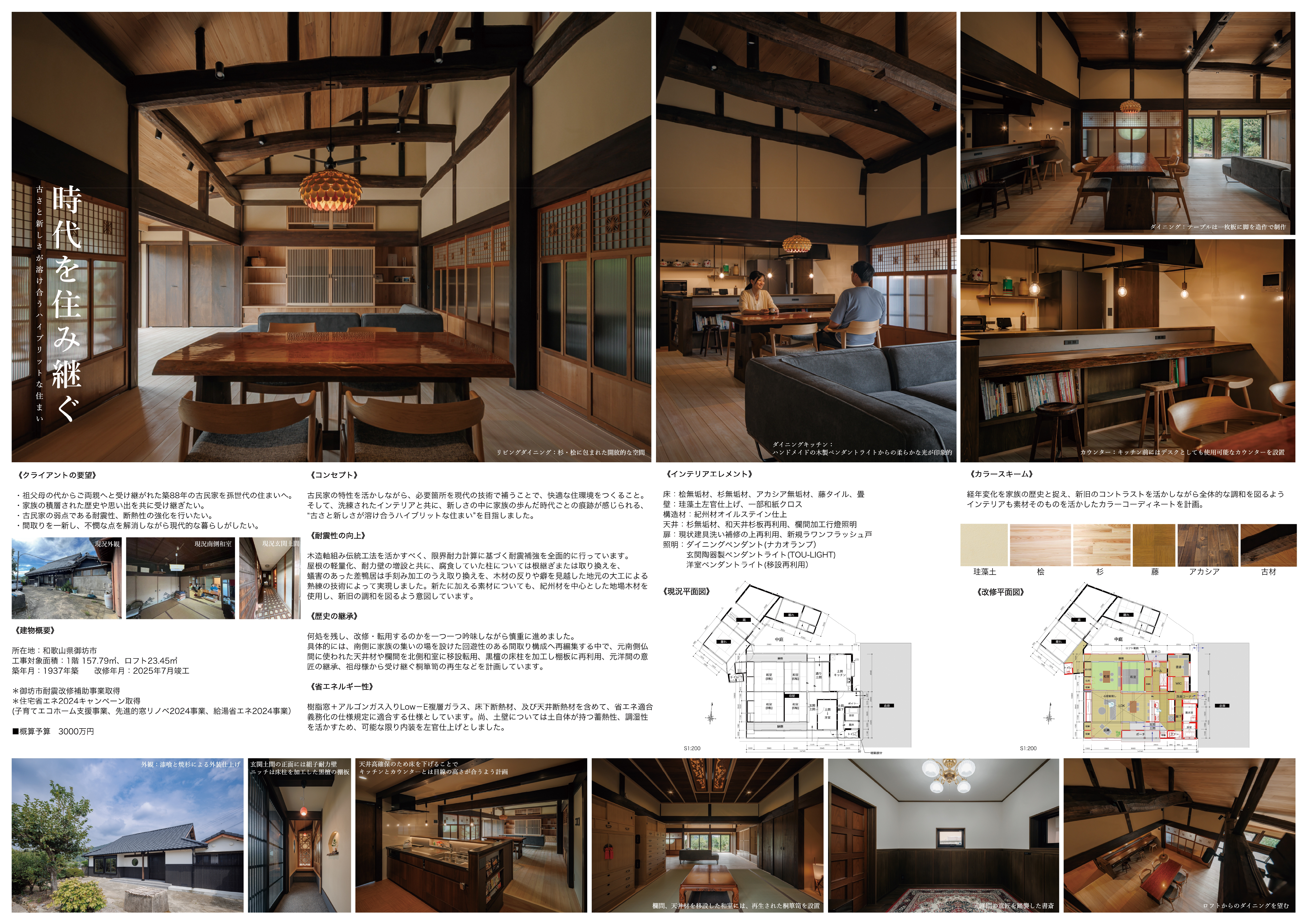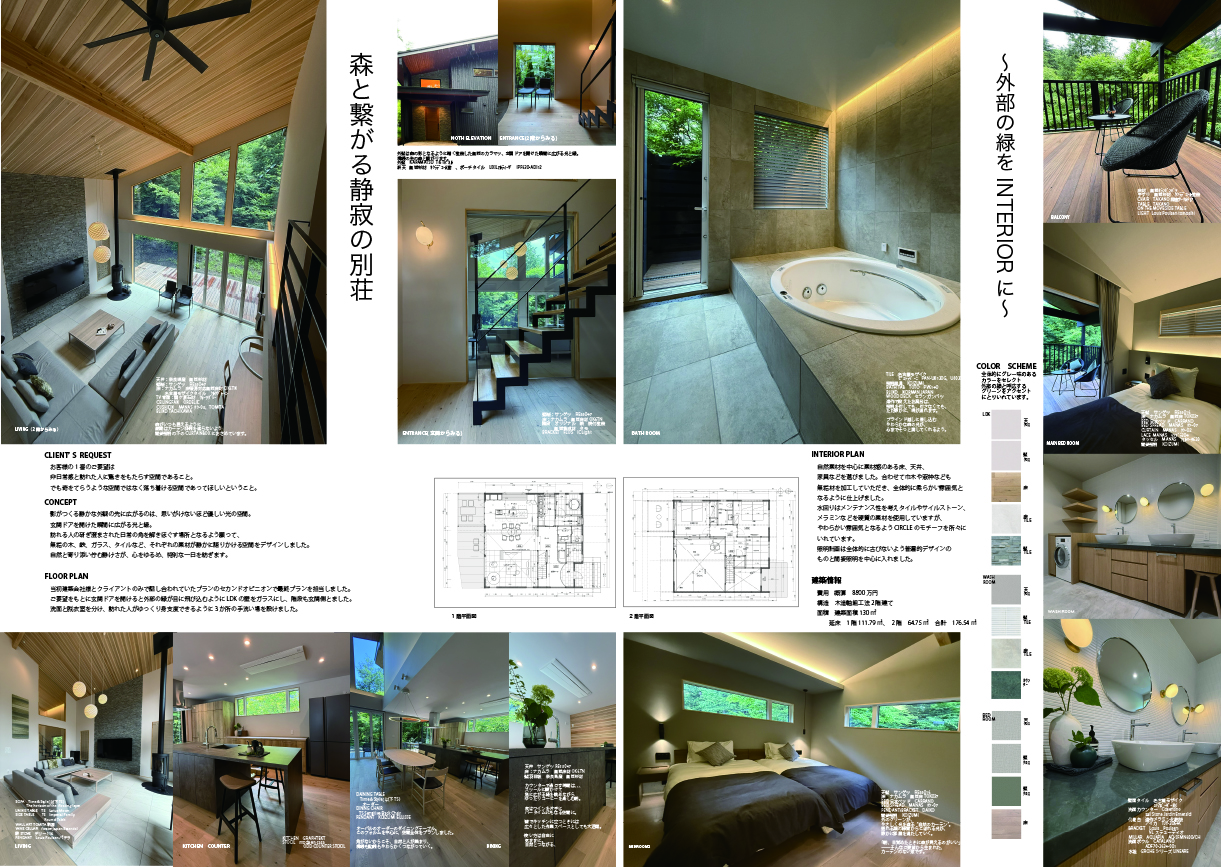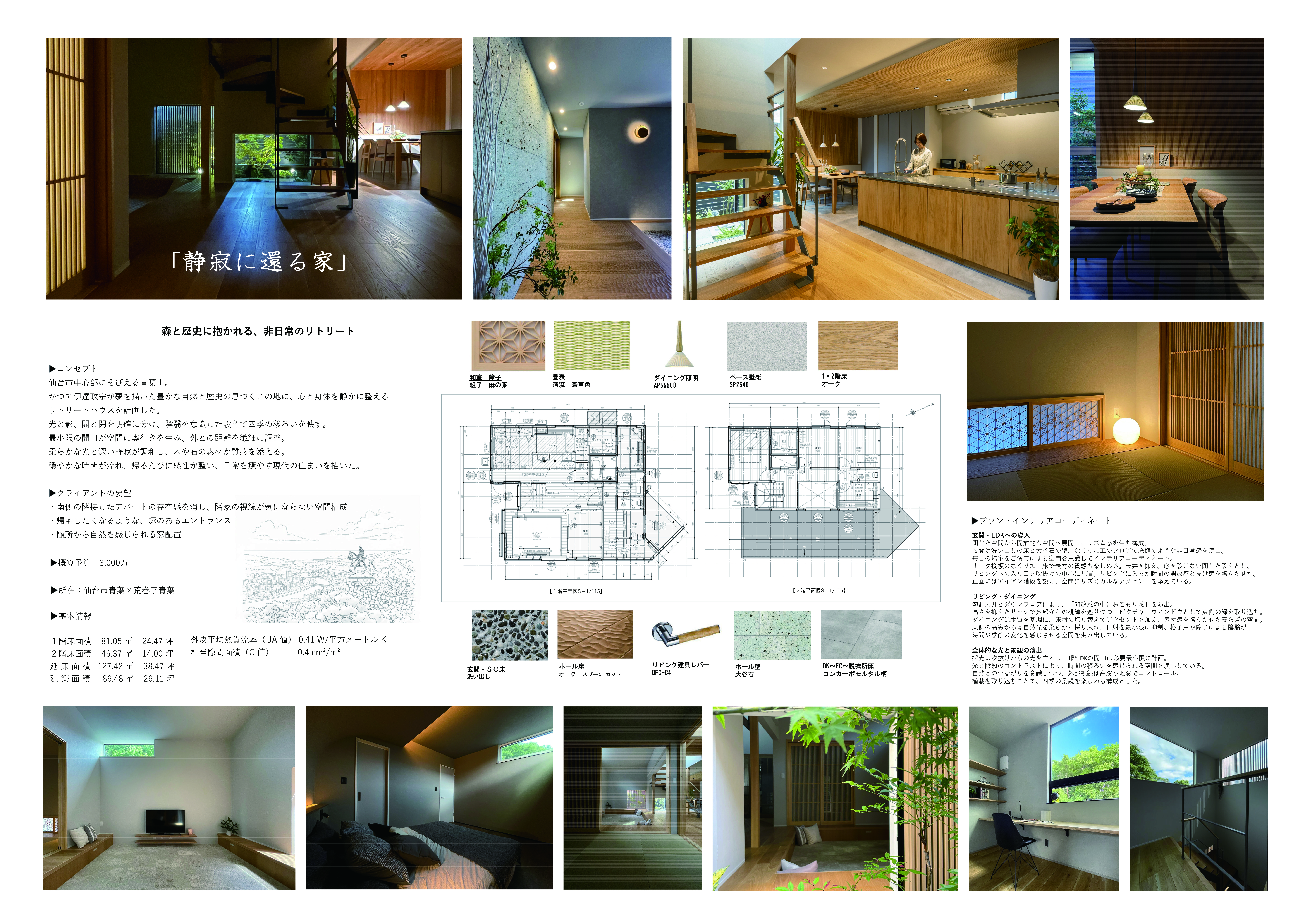 「静寂に還る家」は、施主の要望を平面プランと空間構成で見事に解決し、各素材を丁寧に選び抜いた上質なコーディネートが建物の魅力をより一層引き立てています。設計士の確かな力量を感じさせる作品です。本作品の最も際立つ点は、巧みな空間構成にあります。居室の繋がりと視線の抜け、絶妙な階段配置、効果的な吹き抜け、そして計算された採光の絞りによって、38坪以上の広がりを感じさせる空間を創出しています。また水回りをコンパクトにまとめ、回遊性が取れていることは、日常生活の動線を考慮した実用的なプランニングの証です。素材選びにも細心の注意が払われており、木の温かみを基調としながらも、各素材が互いを引き立て、調和するように丁寧にコーディネートされています。和の要素を現代的な生活様式に溶け込ませる手法は見事です。また、プレゼンはコンテストの趣旨を深く理解し、空間デザインと素材選択の関係性を明確に伝える構成となっています。強いて言えば、玄関側の外観が見られると、内外の調和やアプローチの設計についても評価できたでしょう。「静寂に還る家」というコンセプト通り、日常から切り離された静けさと安らぎを提供しながらも、機能的で美しい住空間を実現した点が、部門最優秀賞にふさわしい作品だと言えます。