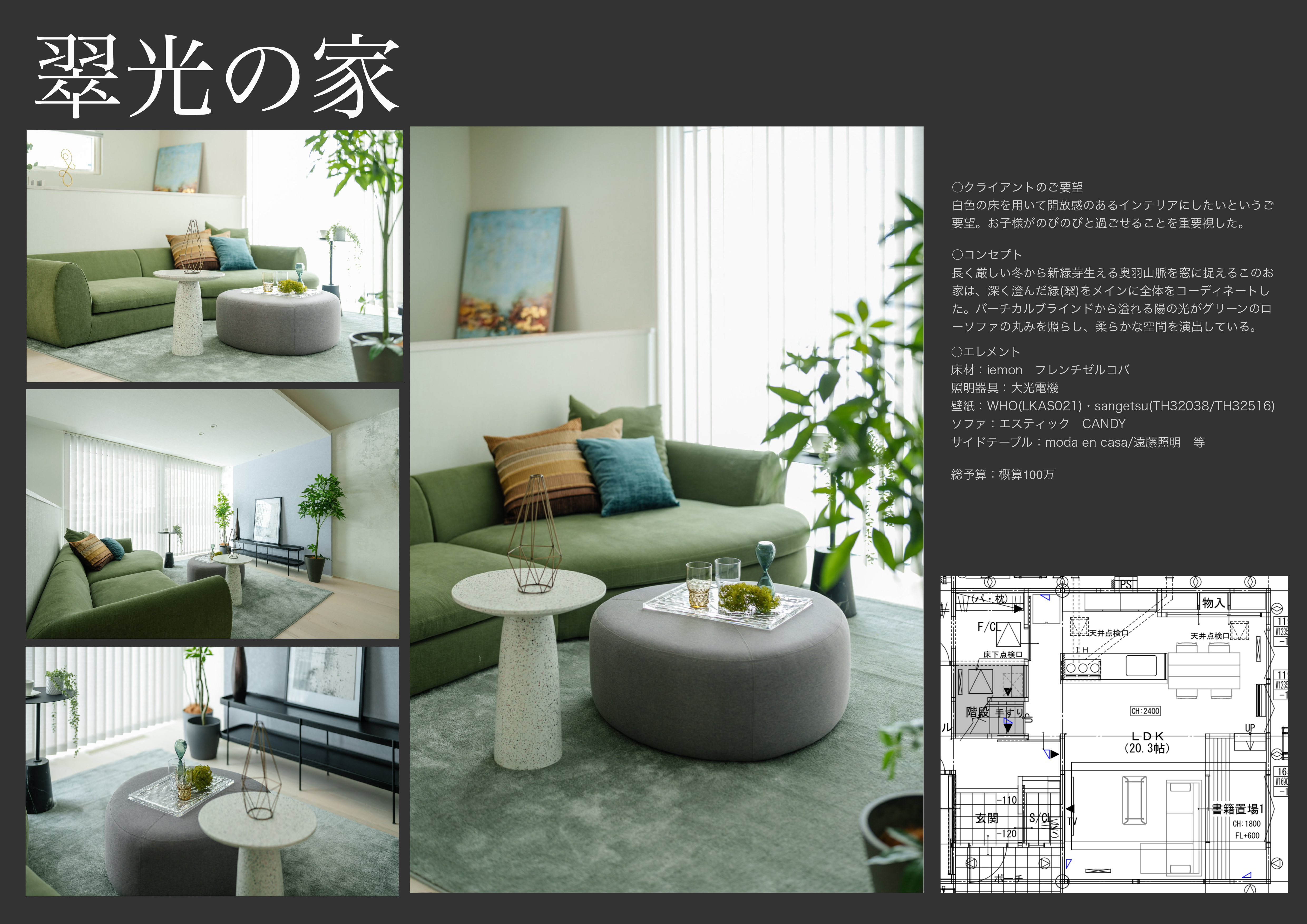 「翠光の家」は、限られたリビング空間の中に洗練されたコーディネートセンスが見事に表現された秀作です。白色の床材が生み出す開放感を基調としながら、深く澄んだ緑(翠)をメインカラーに据えた色彩構成は、現代のトレンドを的確に捉えています。グリーンのローソファをメインとして、クッション、サイドテーブル、ラグ、アート、グリーンなど、必要なアイテムをコンパクトかつ効果的に配した空間構成力に感銘を受けました。各家具の丸みを帯びたフォルムが互いに呼応し合い、バーチカルブラインドを通して降り注ぐ柔らかな光がそれらを優しく照らし出す様は、まさに「光と翠」が織りなす詩的な空間と言えるでしょう。子どもがのびのびと過ごせることを重視しながらも、洗練された美しさを両立させた本作品は、現代の住空間における「居心地の良さ」の理想形を示しています。奥羽山脈の四季の移ろいを感じる窓辺の景観と室内の調和も見事で、インテリアコーディネートの優れたお手本として高く評価いたします。