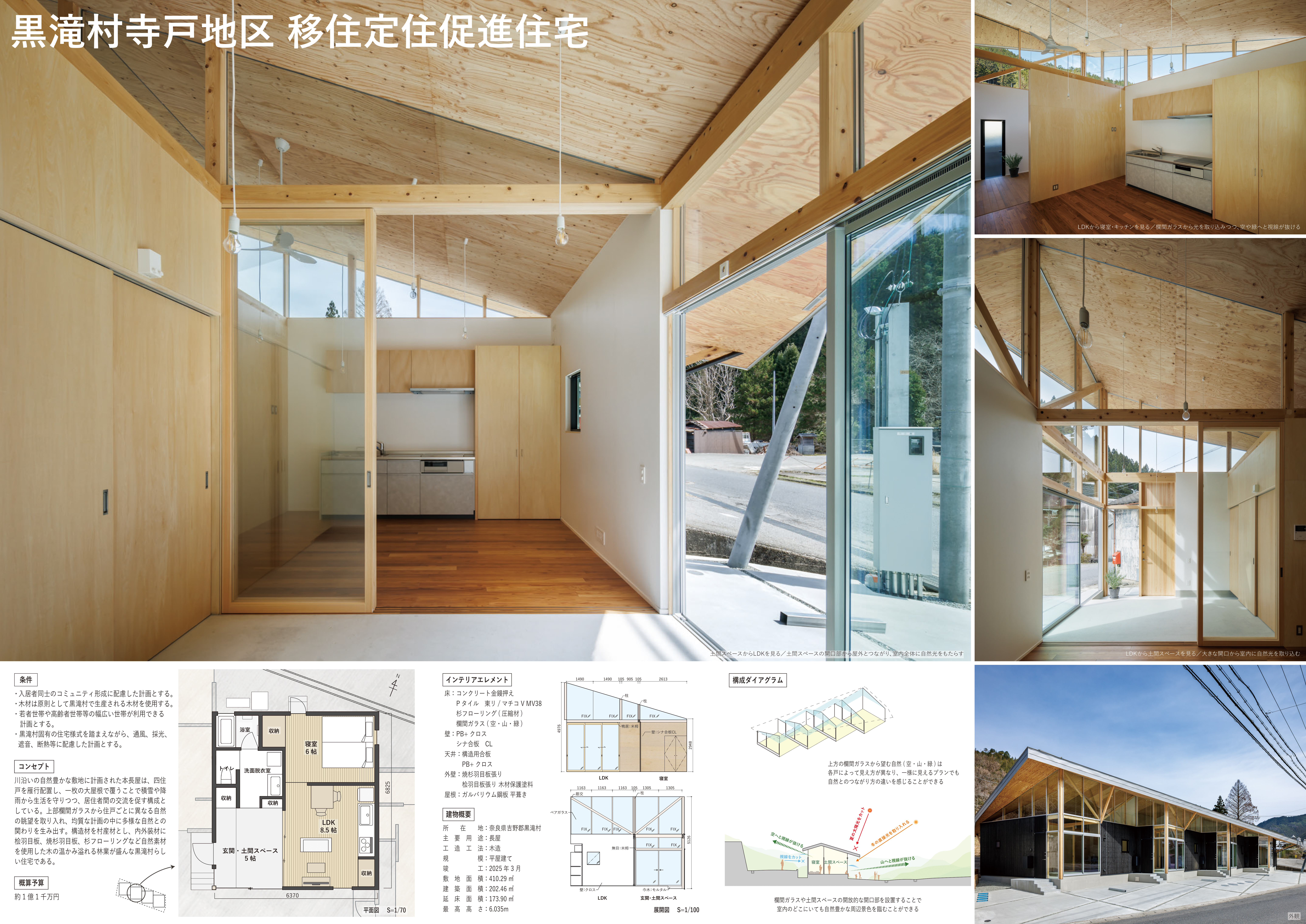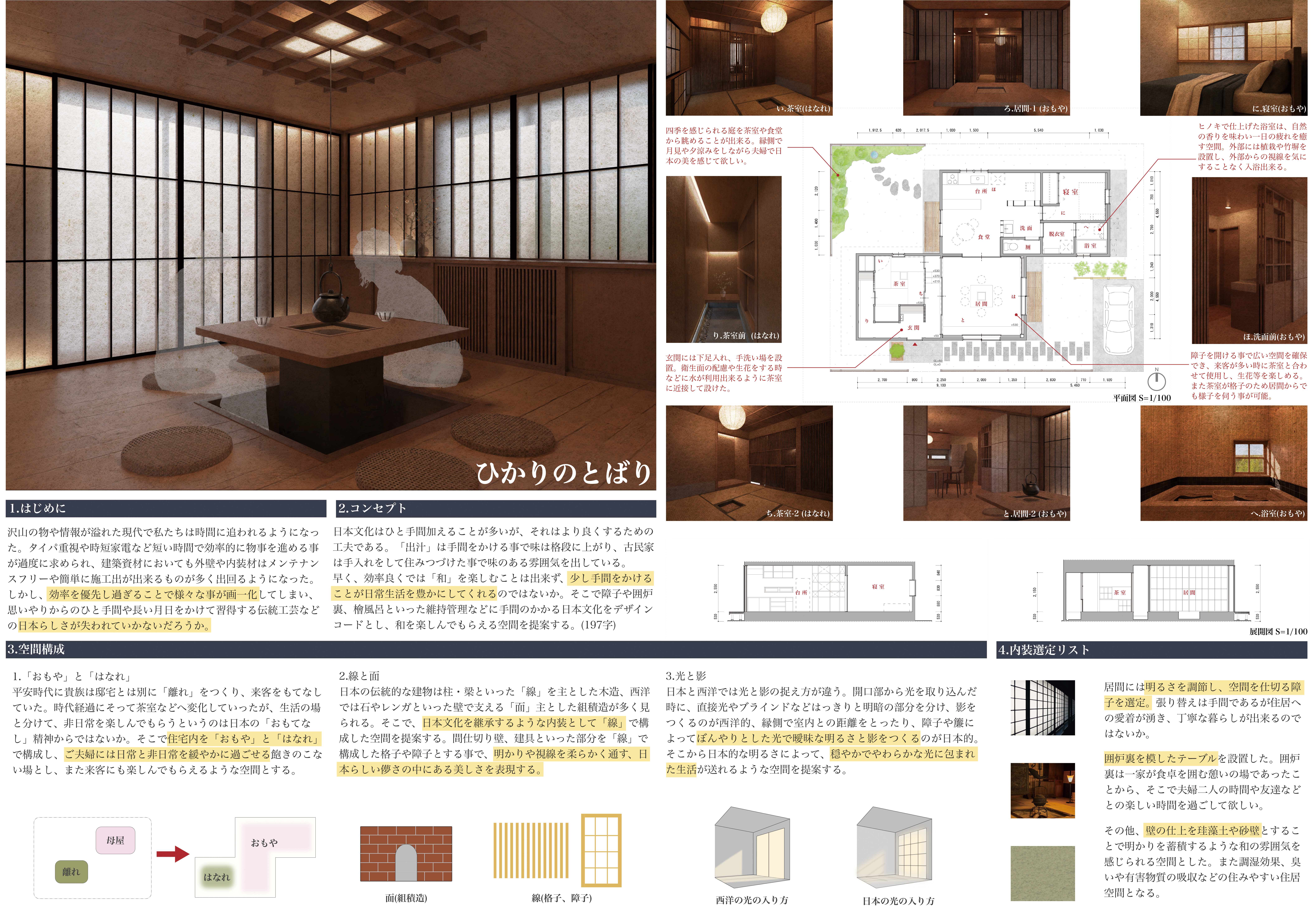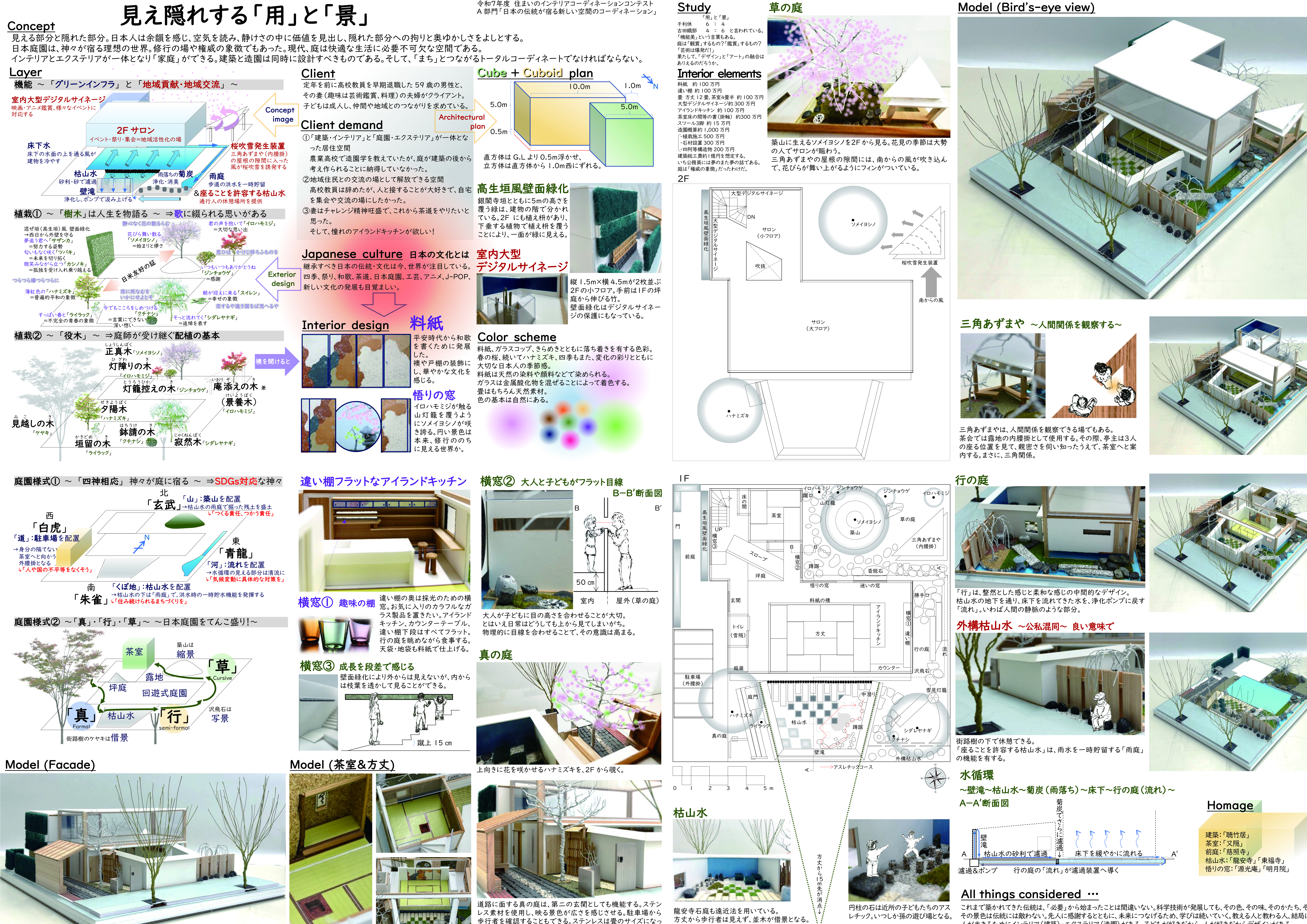 本作品は、A部門の課題である「日本の伝統が宿る」というテーマに対して、和の意匠を表層的に寄せ集めるのではなく、機能性と景観を往来させる「用」と「景」の哲学、内と外が連続する日本的空間観、そして奥ゆかしさを生む「隠す美意識」など日本文化の核心を確かに捉えた点が際立っています。生活行為としての「用」を的確に満たしながら、その必然的な配置を通して「景」へと昇華していく構成は、機能美と構成美の均衡を見事に実現しています。また、室内と庭の関係性にとどまらず、自然風景を象徴的に表現する枯山水も採り入れて自然の循環にまで思考を広げ、すべてが一つにつながる日本の空間哲学を空間全体で表現している点も特筆されます。加えて、あえて全体を見せず一部を「見え隠れ」させる設えは、余白に想像を誘う日本の奥ゆかしさを的確に体現しています。さらに、精巧に作り込まれた模型と、その魅力を最大限に伝えるプレゼンシートの構成は非常に完成度が高く、作品の思想に強い説得力がありました。本年度のテーマに対し、最も本質的な回答を示した秀逸な提案です。