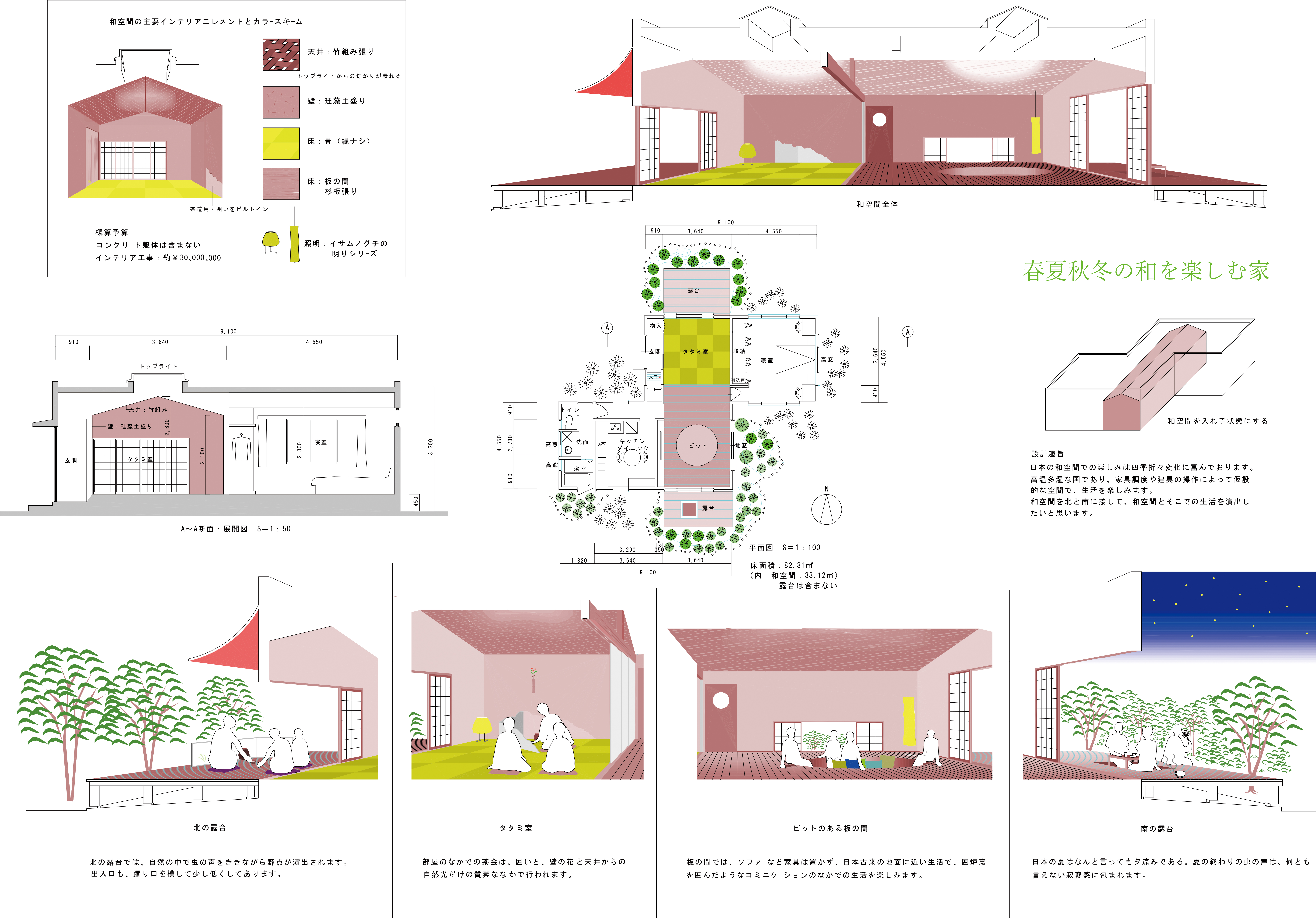 日本の美意識と伝統的な暮らしの知恵を巧みに取り入れたインテリア空間が、提案されたデザインにおいて実現されている。南北に入れ子状に挿入された和空間は、家具調度や建具が作り出す日本の仮設的空間を彷彿とさせる。またそれによって住まい全体に奥行きを醸し出している。そこは日本の高温多湿な気候風土を受け入れ、四季折々の変化から生活の楽しみを導いている場といえる。北の露台は野点の場となり、虫の音に耳を傾けながら茶を楽しむ静謐な時は、自然との一体感をつくりだすであろう。躙(にじ)り口を模した低い出入り口は、日常と非日常を分かつ象徴的な仕掛けとなっている。室内空間は、天井の竹組み張りを通る柔らかな自然光で演出され、余分な装飾を排したより精神性を高めた場となっている。板の間では、床座の生活が再構築されている。囲炉裏風の場所はそれを囲む家族や客人との親密な場を作り上げるであろう。南の露台では、夏の夕涼みの文化が大切にされている。虫の音がもたらす季節の情緒が映し出されるようなインテリアコーディネーションになっていると言える。