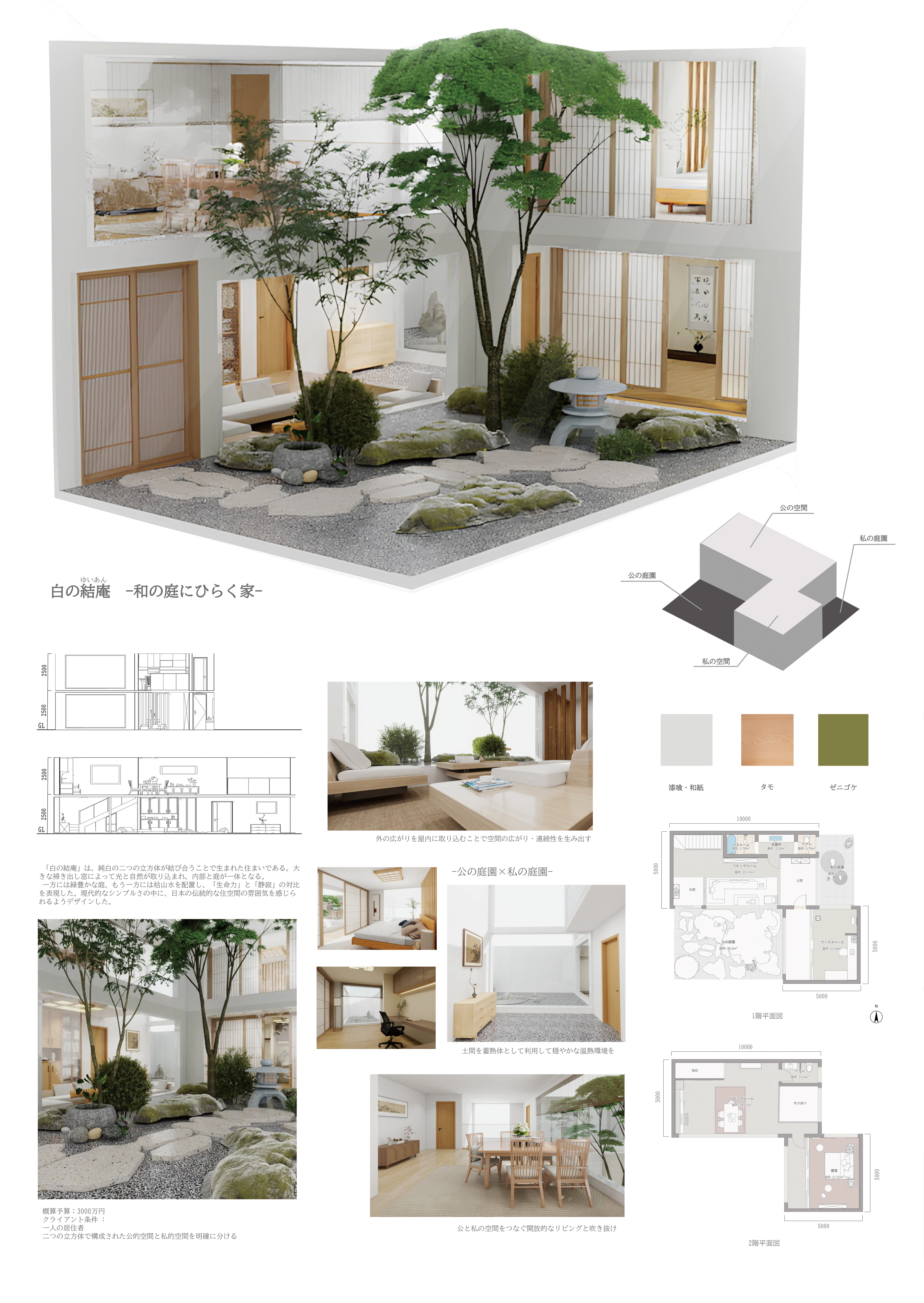 『白の結庵』は、課題の2つの立体をL型に配置し、それらを少しずらすことによって、四角の敷地に性格の異なる二つの庭を作り出している。「公の庭園」では伝統的な和風庭園で季節の移ろいを楽しみ、一方の「私の庭園」は石庭を思わせる静寂さを味わうことができる。さらに、内部に吹き抜けのある土間を設けることで、空間全体に連続性と変化がもたらされている。インテリアコーディネートには白を基調とする自然素材が用いられ、日本の伝統を感じられる完成度の高い作品に仕上がっている。本作品は、インテリアスタイルが和風にまとめられているにも関わらず、安易に和室をつくらず、いす座の生活を成り立たせるように工夫されている。1階のワークスペースや2階の寝室では、庭との間に縁側的なスペースを挟み、和と洋を無理なく繋いでいる。1階のリビングでは、床が低くなったところにソファがあること(ピットリビング)により、視覚的に空間に奥行きと広がりを生み、床の段差はリビングのくつろぎスペースを自然に区切る役割を担っている。また、視線を下げることで、和室に座って庭を鑑賞する目線の高さで、和風に作られた公の庭園を眺められるように設計されている。