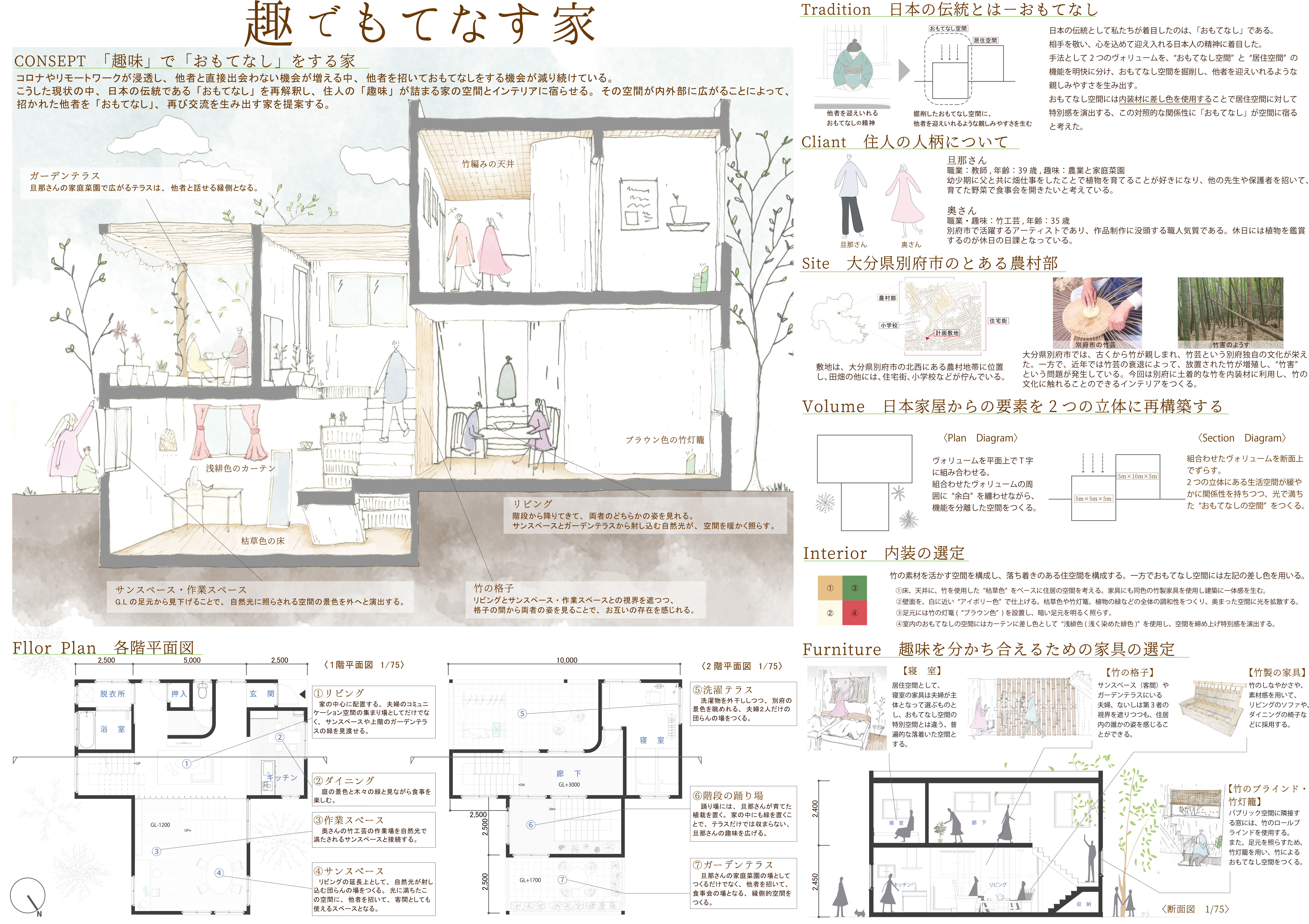 本年度の作品は、人々の「暮らし」や「ライフスタイル」の広がりを受け止めつつ、住まいに流れる空気の揺らぎや、そこに潜む気配の微細な変化に静かに耳を澄ませながら、それぞれが独自の視点とコンセプトをもって紡がれていると感じた。素材の温度、光の滲み、庭の余白、動線の柔らかな曲線――そうした繊細な手がかりを通して、住まいの奥に潜む本質へそっと触れようとする姿勢が、多くの作品に宿っていた。課題分野では、和の素材や意匠への敬意を基盤に、そこに暮らす人の価値観や物語が静かに折り重なり、空間そのものがひとつの情景として立ち上がる提案が際立った。四季の光や風が空間を巡り、伝統と現代がゆるやかに呼応していた点が印象的である。事例分野においても、クライアントの生活の芯を丁寧にくみ取り、立地や既存建物の特性と響き合わせながら、何を優先し、どこに焦点を置くかを静かに見極めるまなざしが感じられた。生活とデザインが穏やかに調和し、空間に深い余韻と厚みを与えていた。今年の作品群は、住まいとは何を受け止め、どのように育む場であるべきかという問いに、静かで力強い答えを示している。
