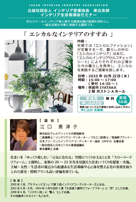 【秋田県開催】(公社)インテリア産業協会東北支部主催セミナー「エシカルなインテリアのすすめ」(2025年10月22日)