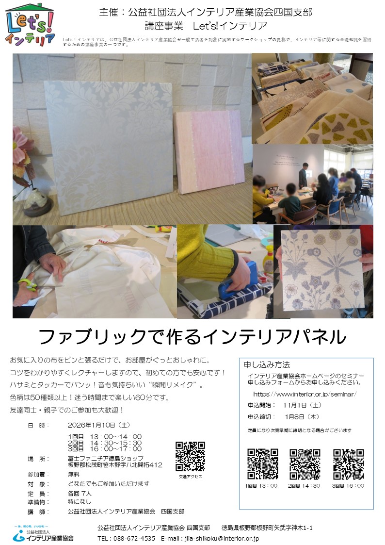【徳島県開催】インテリア産業協会四国支部主催ワークショップ「Let's!インテリア ~ファブリックで作るインテリアパネル~」(2026年1月10日(土) 3回目開催)