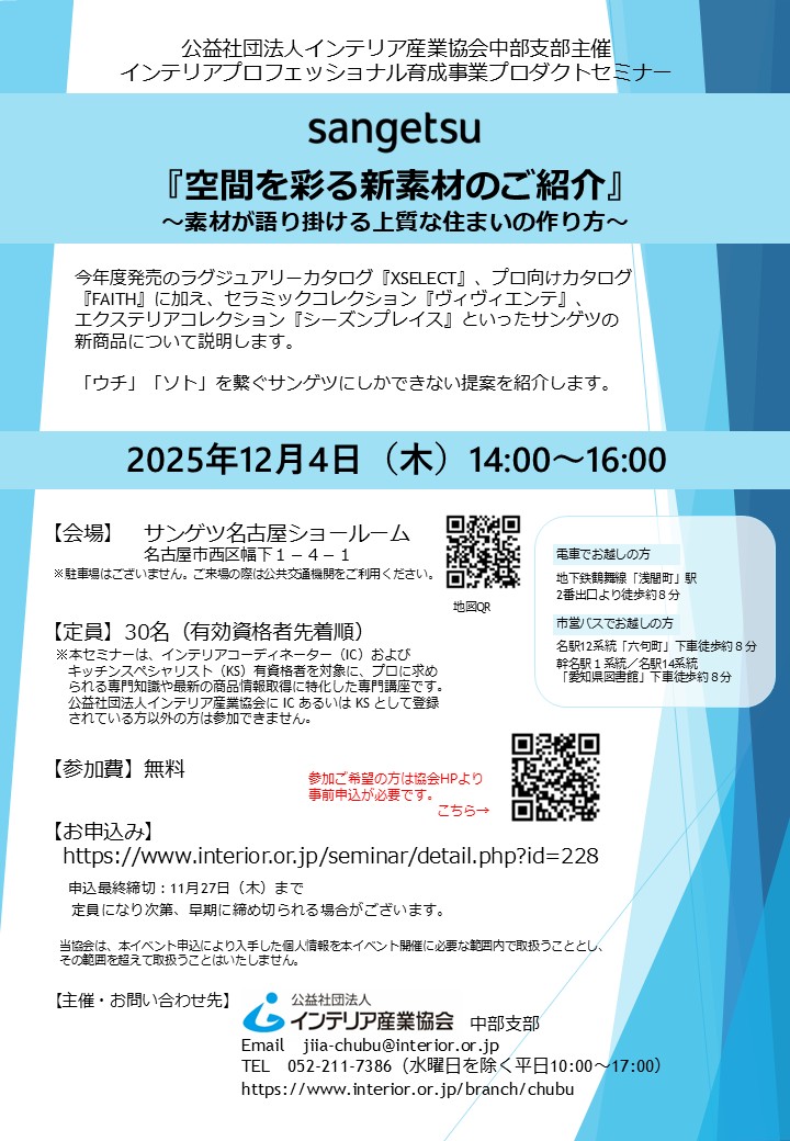 【資格者限定】(公社)インテリア産業協会中部支部主催プロダクトセミナー『空間を彩る新素材のご紹介』 ~素材が語り掛ける上質な住まいの作り方~(2025年12月4日開催)