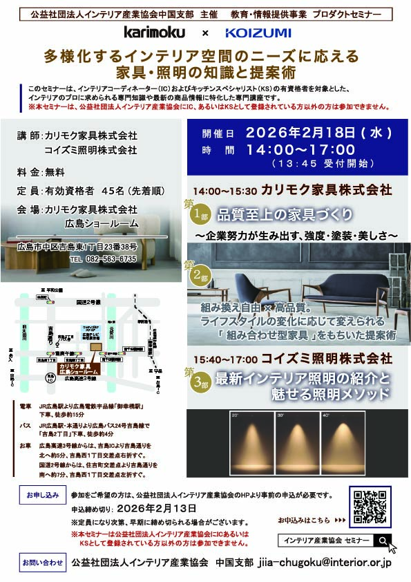 【資格者限定】 (公社)インテリア産業協会中国支部主催「多様化するリビング空間のニーズに応える。家具・照明の知識と提案術」(2026年2月18日開催)