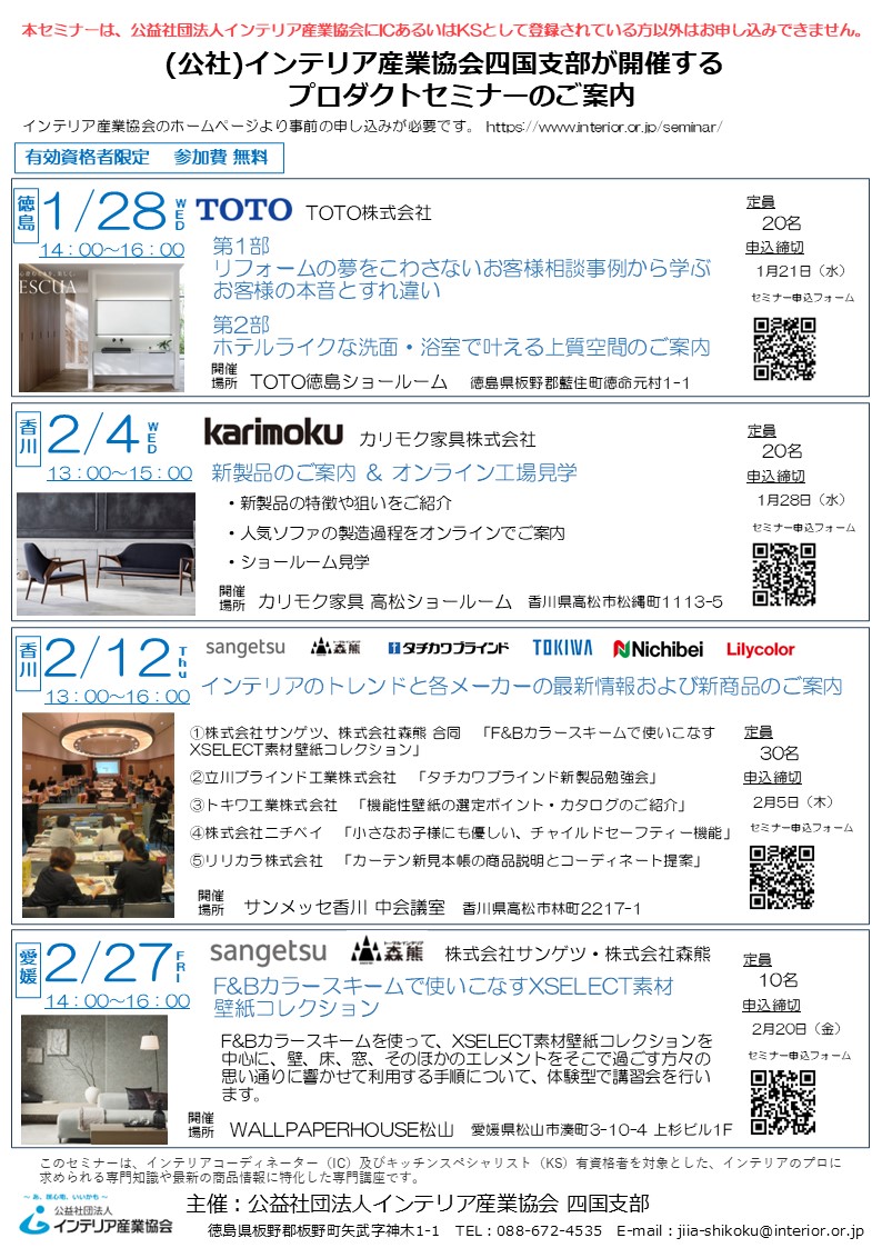 ※お申し込み後、5業務日を過ぎても支部からの連絡が確認できない場合は、四国支部事務局( jiia-shikoku@interior.or.jp )まで