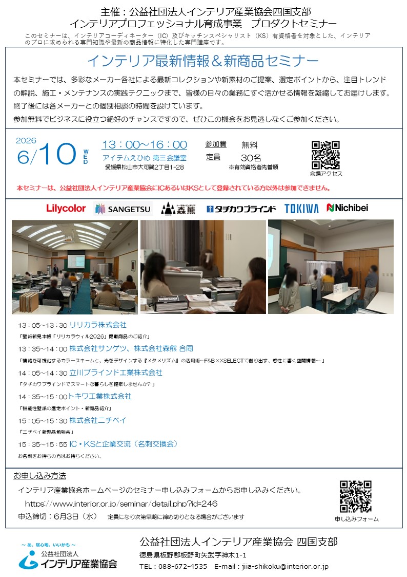 【資格者限定】 (公社)インテリア産業協会四国支部主催プロダクトセミナー「インテリア最新情報&新商品セミナー」(2026年6月10日開催)